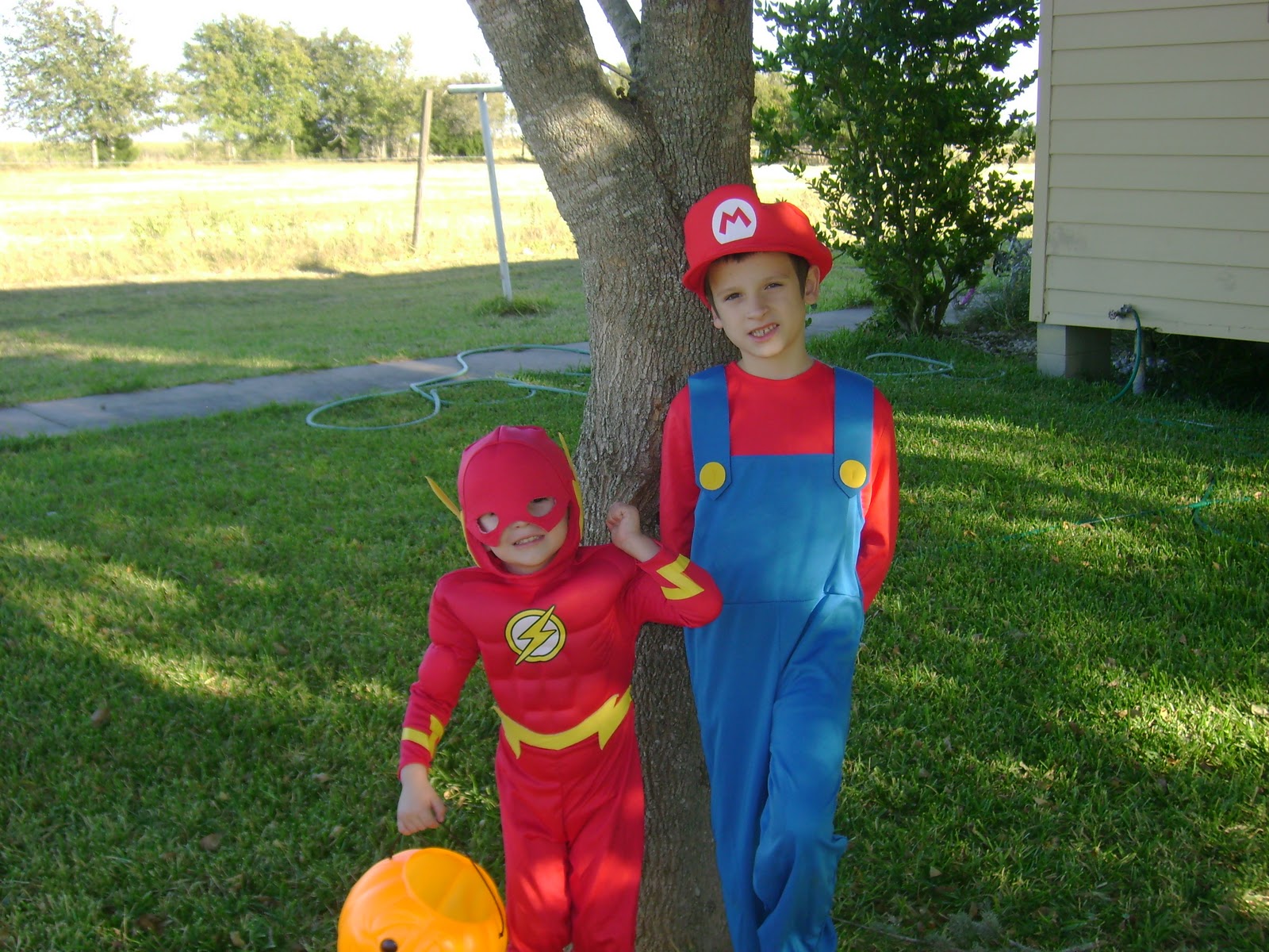 The next day we went to church and the boys could not stop asking when we were going to go trick or treating. Nathan made the boys take a nap. Chase just laid on the floor in Brendan's room and never fell asleep. About 5pm we headed out to the Washington County Fairgrounds where we had another Fall Festival to go to. This one was put on by several churches in the community and other organizations. I think they had a pretty good turn out. We did not stary very long because it got crowded. Sorry Butch I did not see Independence there this year unless they were hiding in a different spot. Kind of sad. After we left there went to go knock on doors. We go to a neighborhood in Brenham where we have several friends that live. I was telling Nathan that I thought there were more houses built over this past year because it was such a long walk around there. They both had big pumpkin buckets and they were both filled to the rim. We did not even go to all the houses. We were so tired that we called it quits. They were happy they had full buckets of junk food. This night Chase was still Mario, but Brendan went as Flash the superhero. The best part is we only had to buy Chase's costume this year. The Fire Fighter outfit was Chase's from when he was younger and the other costume Brendan found in a bag of clothes handed down to us by friends. Yeah! Saving money is great.